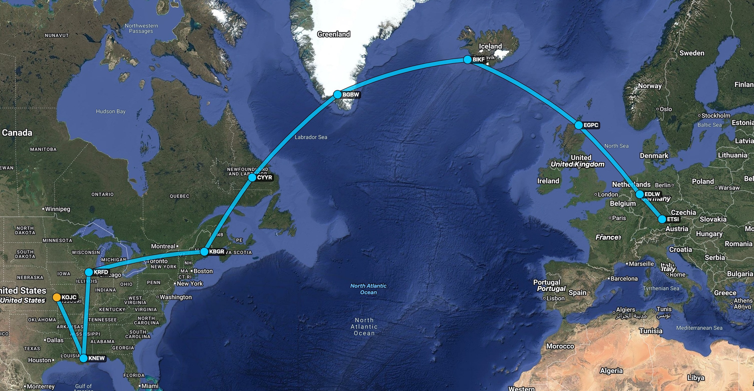 Der eigentliche Ferry-Flug startete in Chicago (KRFD) und führte die Crew in nur drei Tagen über mehrere Etappen nach Dortmund (EDLW). Die Route war klassisch gewählt: Zuerst ging es nach Bangor (KBGR) in Maine, dann weiter nach Goose Bay (CYYR) in Kanada.